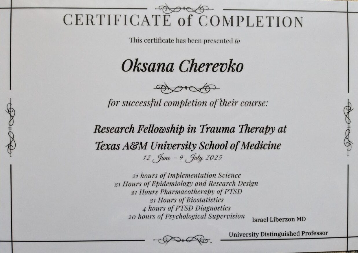 У вересні 2022 року аспірант кафедри Оксана Черевко пройшла навчання з застосування протоколу реконсолідації травматичних спогадів (RTM) в The Research and Recognition Project’s School, New York state American Legion Grant RTM.